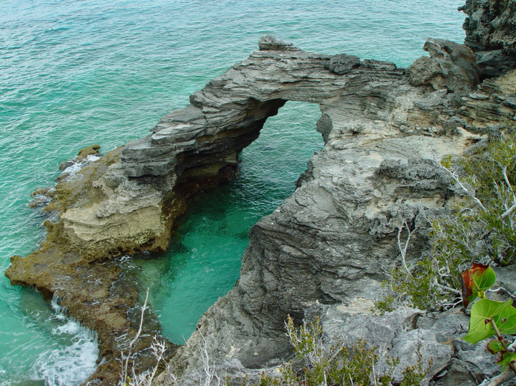 Natural arch in Rum Cay - opening formed underneath natural rock due to erosion from the sea or weathering (subaerial processes).