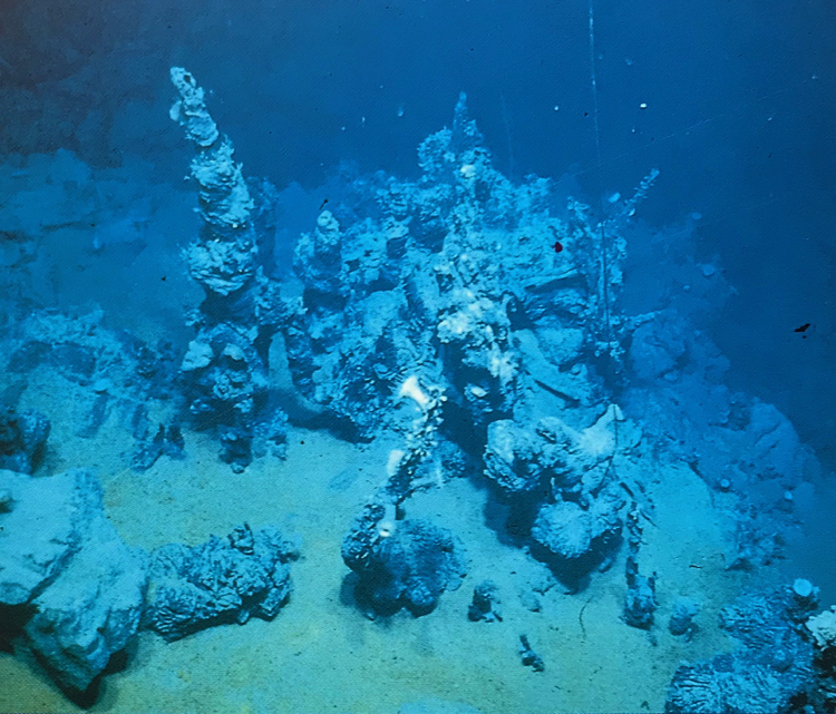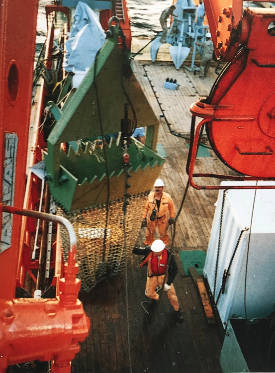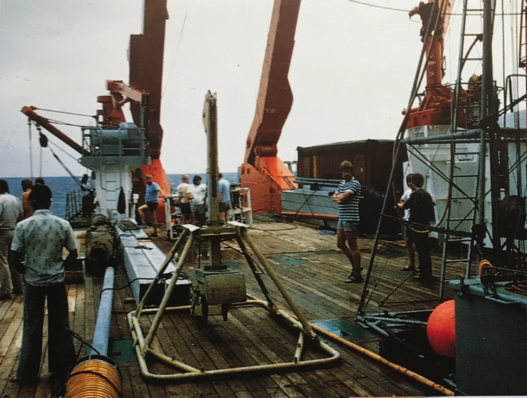 The RV Sonne, a German deep ocean research vessel operated by the University of Hamburg's Institute of Geology in Germany, specializes in conducting seabed surveys (bathymetry) with different high-precision echo-sounding systems and seismic surveys. The RV Sonne was a former German fishing trawler converted into a research vessel by Schichau Unterweser AG, doing mostly geoscience related oceanographic research for a variety of commercial and scientific clients. This research vessel is a multipurpose working platform for marine and related disciplines: physical and biological oceanography, marine geology, marine and atmospheric chemistry, marine geophysics and meteorology. Though RV SONNE operates mainly in the Pacific and the Indian Oceans, Dr. Alshuth participated in a geophysical research expedition to the Central North Atlantic, assisting in testing and documenting geophysical and seismic instruments used for bathymetric research in 1991. Dr. Alshuth used her photographs to write and compose the shipping company's booklet: The re-construction and lengthening of the RV SONNE, and other publications including: