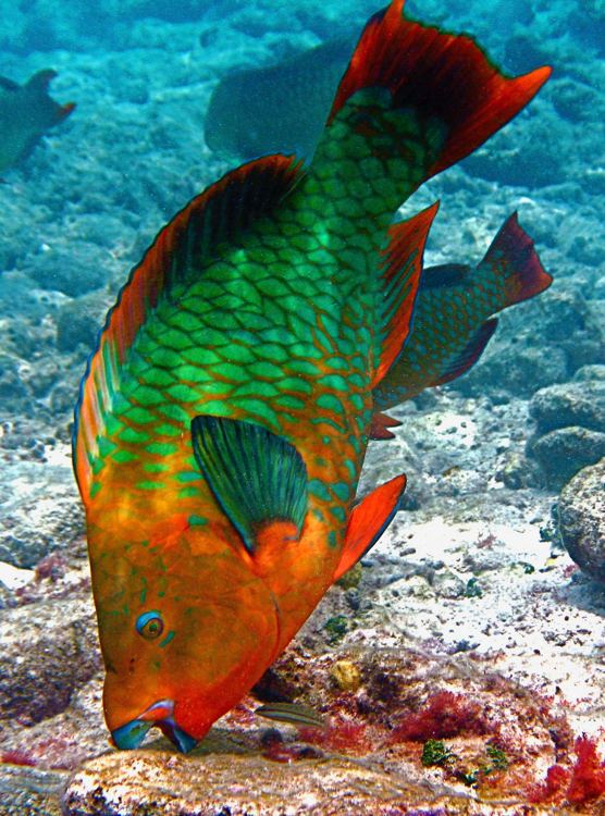 Rainbow Parrotfish scrape algae off rocks and corals with parrot-like beaks, grind up inedible calcium-carbonate, and excrete it as sand.