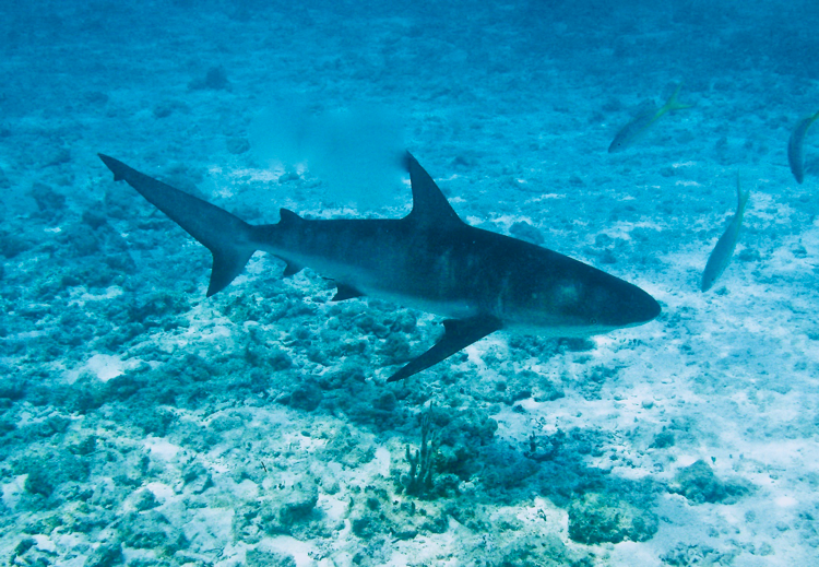 Solitary Tiger Shark (Galeocerdo cuvier) cruising the Bahamian reefs.
