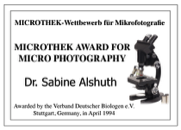 Dr. Alshuth 's passion for the ocean is reflected in her photos that now number over 140,000. Her photographs have been published in a variety of international and German magazines, various professional websites and her online marine science course textbooks. She continues to use her photo and video collections from land and underwater expeditions in her graduate and undergraduate course presentations and her online course development. Dr. Alshuth was awarded in 1996, 1988 and 1994 with the Microscopic Photography Award by the German Microscopic Society. In 2009 she received the first prize award for her underwater photography by KonTiki Resort, and in 2012 and 2013 two photography awards by Insel Airlines for her reef photography.